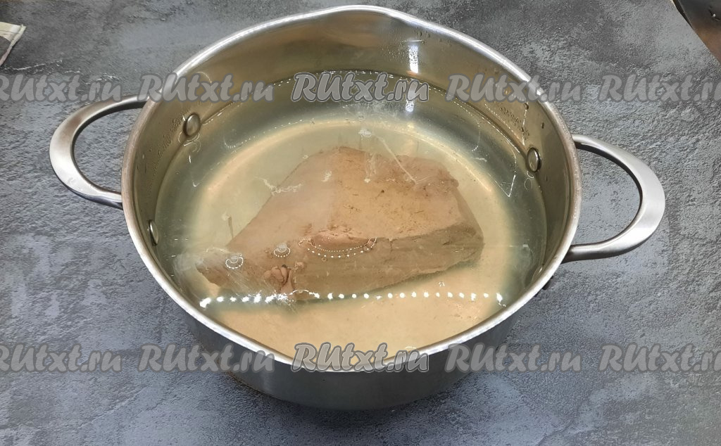 В кастрюле вскипятить воду, поместить в кипящую воду говяжью печень, очищенную от плёнки, и варить 20-25 минут. За 10 минут до готовности добавить соль. Готовность печени можно проверить следующим образом: прокалываем вилкой печень и надавливаем на неё, если из проколов выделяется прозрачный сок, значит печёнка готова, а если выделяется красный (или розовый сок), то варим ещё 5-10 минут. Готовую печень достать из воды и полностью остудить.