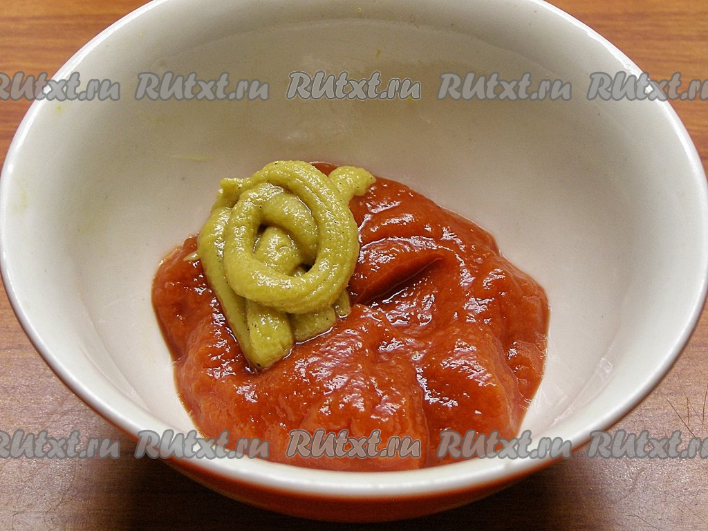 Для смазывания верха мясного хлеба смешиваем томатную пасту с горчицей.