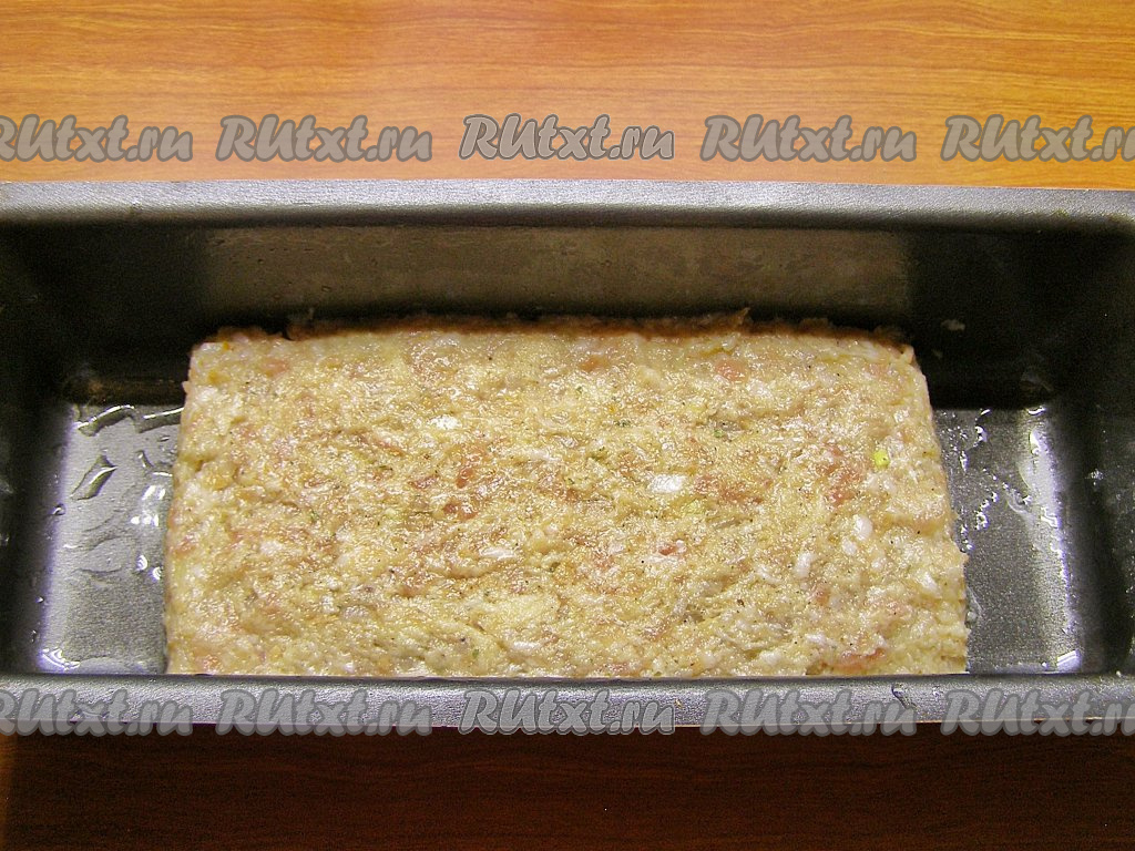 Слегка смазываем растительным маслом форму для запекания и выкладываем в неё получившийся фарш, придаём будущему мясному хлебу форму кирпичика. Если у вас нет прямоугольной формы, можно сформировать батон на противне, предварительно застелив его бумагой для выпечки, смазанной маслом.