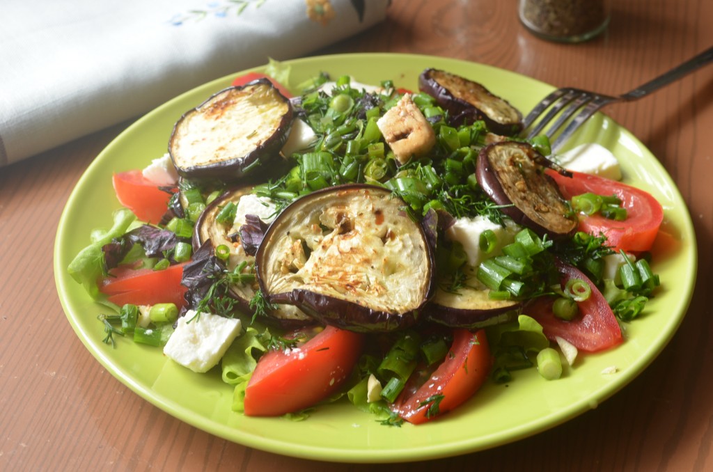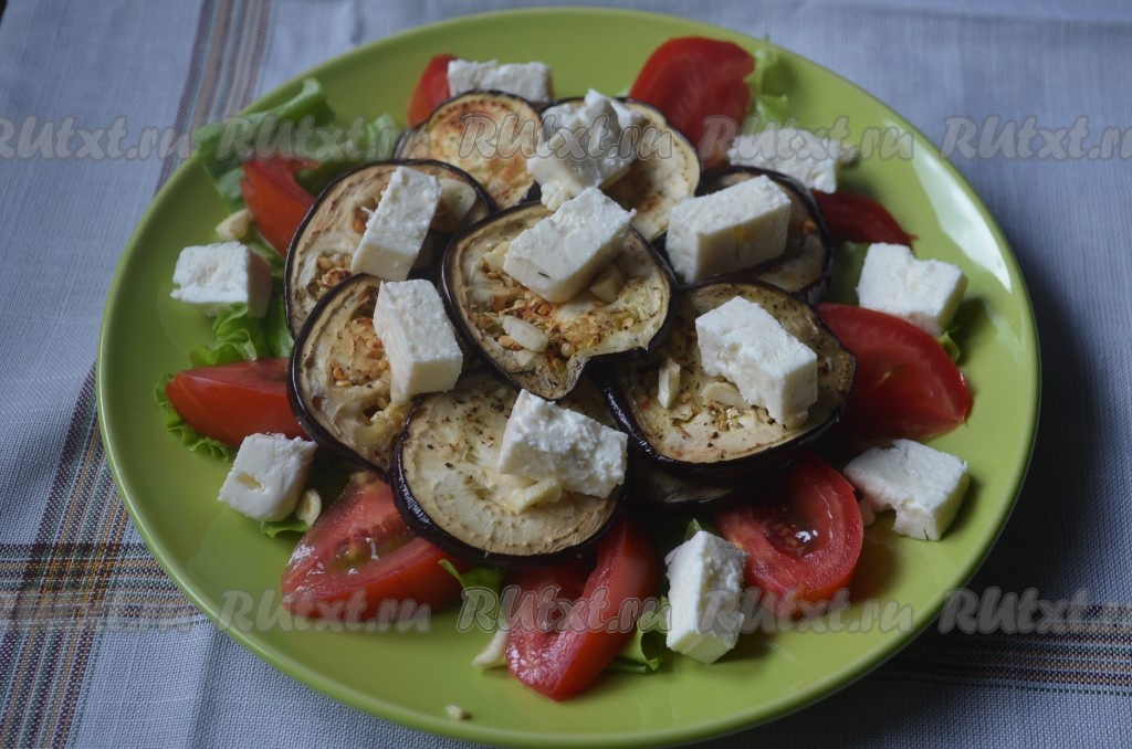 Баклажаны прекрасно сочетаются с другими овощами. Поэтому из баклажанов готовят салаты, закуски, запеканки, супы, а также всевозможные соления. Хочу поделиться с вами простым рецептом приготовления вкусного, достаточного сочного и аппетитного салата с баклажаном, адыгейским сыром и помидором. Это блюдо отлично разнообразит меню!