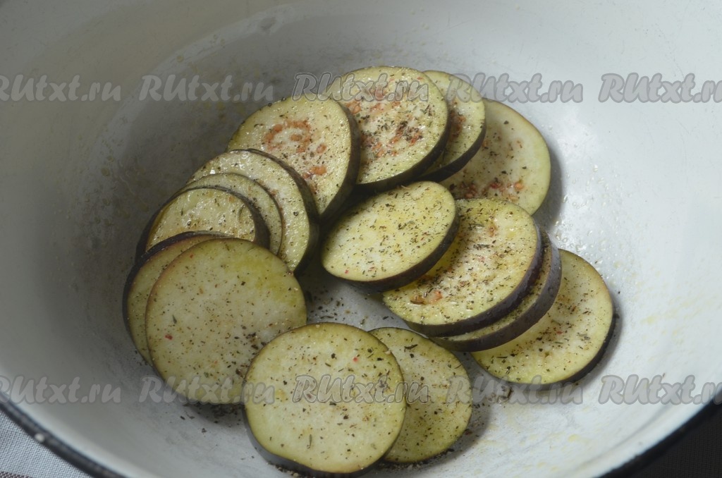 Баклажан нарезать на кружочки толщиной 0,5-0,7 сантиметров, посолить. Дать кружочкам баклажанов полежать минут 10-15, затем отжать от лишней жидкости (это делается для того, чтобы готовые баклажаны не горчили). Слегка полить баклажаны маслом и втереть масло руками в каждый кружочек баклажана. Жарить баклажаны мы будем на сухой сковороде. Благодаря маслу, которое мы втирали в баклажаны, овощи не будут приставать к сковороде в процессе жарки, но при этом и жирными они не будут. Поперчить баклажаны.
