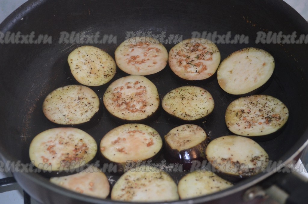 Разогреть сухую (или слегка смазанную маслом) сковороду, выложить баклажаны в один слой, обжарить их с двух сторон до золотистого цвета на среднем огне. Убрать с огня, дать остыть.