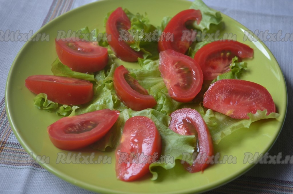 Зелень, помидор вымыть, обсушить. Чеснок очистить. На блюдо для подачи, по желанию, выложить предварительно вымытые и слегка обсушенные листья салата. Затем выложить помидор, нарезанный на ломтики, слегка присолить.