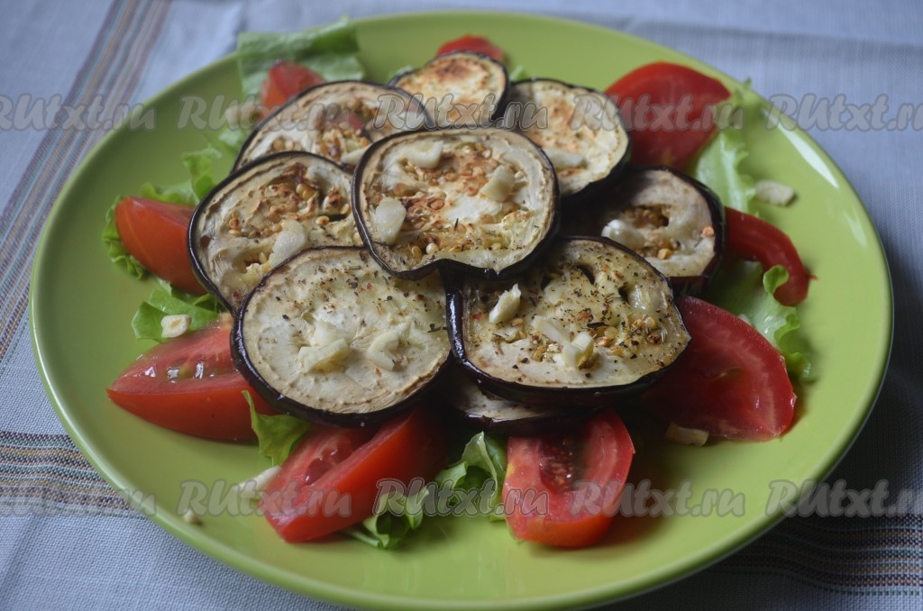 На помидоры выложить обжаренные баклажаны. Посыпать салат мелко нарезанным чесноком.