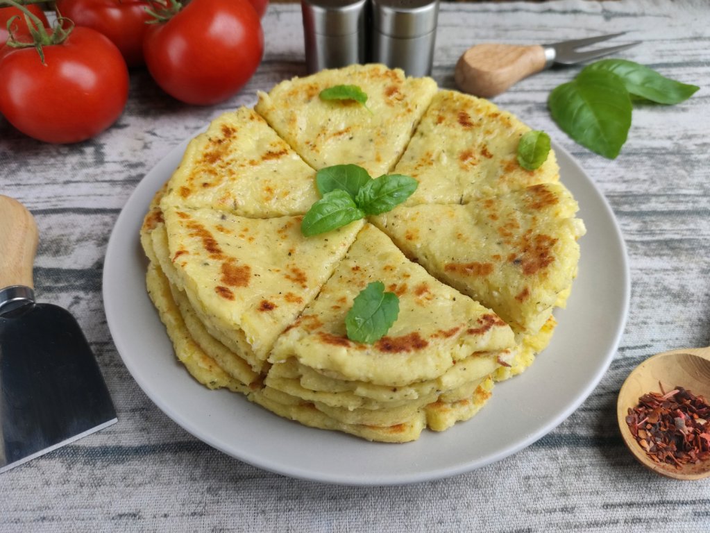 Стопку готовых лепёшек разрезать на сектора, украсить свежей зеленью и подать к столу. У картофельно-творожных лепёшек мягкая, нежная структура и приятный вкус. Они отлично сочетаются со сметанным соусом и домашним кетчупом.
