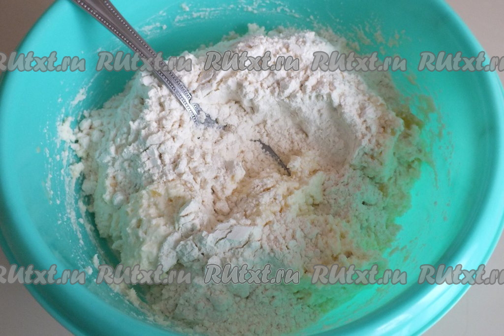 Всыпьте к творожно-банановой массе 8 столовых ложек без горки муки и соль, перемешайте, тесто должно получиться в меру плотным, не липнущим к рукам.