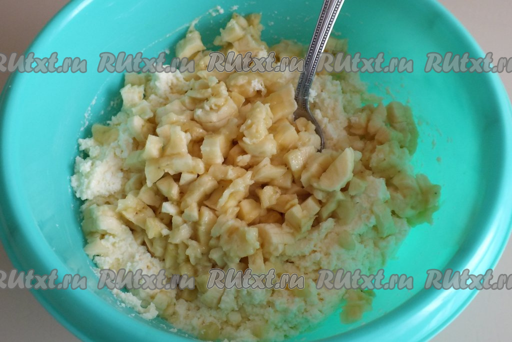 Добавьте бананы в миску с творожно-яичной массой, перемешайте.
