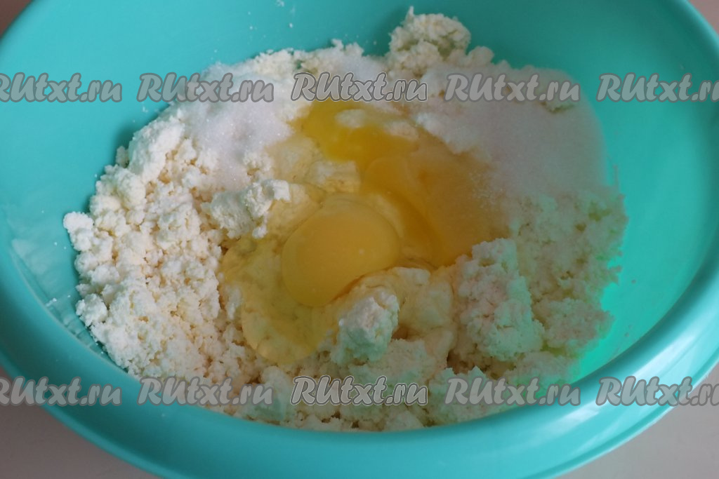 Творог выложите в миску, разомните вилкой. Добавьте яйца, сахар, перемешайте.