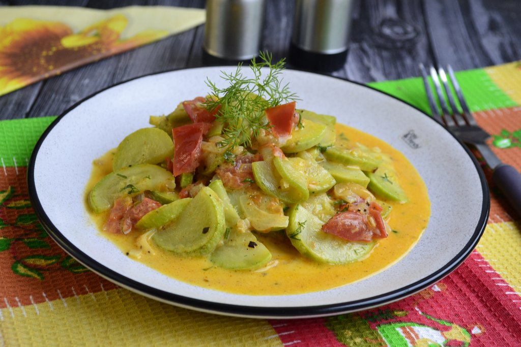 Очень вкусные кабачки с помидорами, тушёные в сметане, к столу подавать тёплыми.