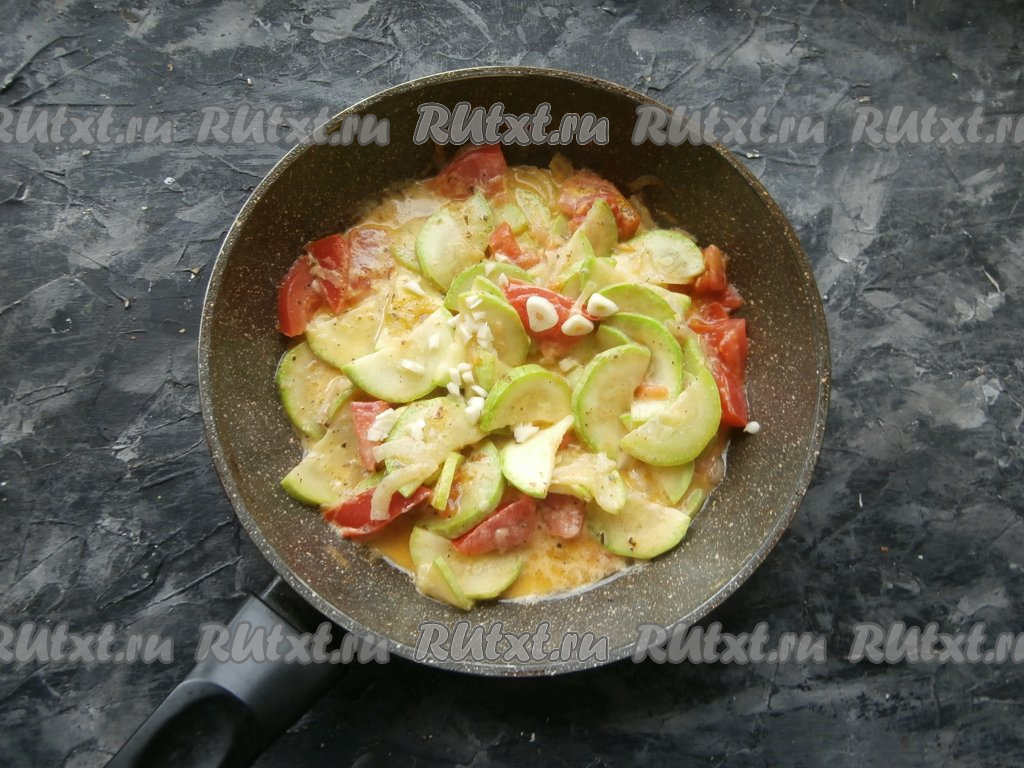 Перемешать и тушить кабачки с помидорами и луком в сметане под прикрытой крышкой 5 минут. Затем добавить измельчённый чеснок.