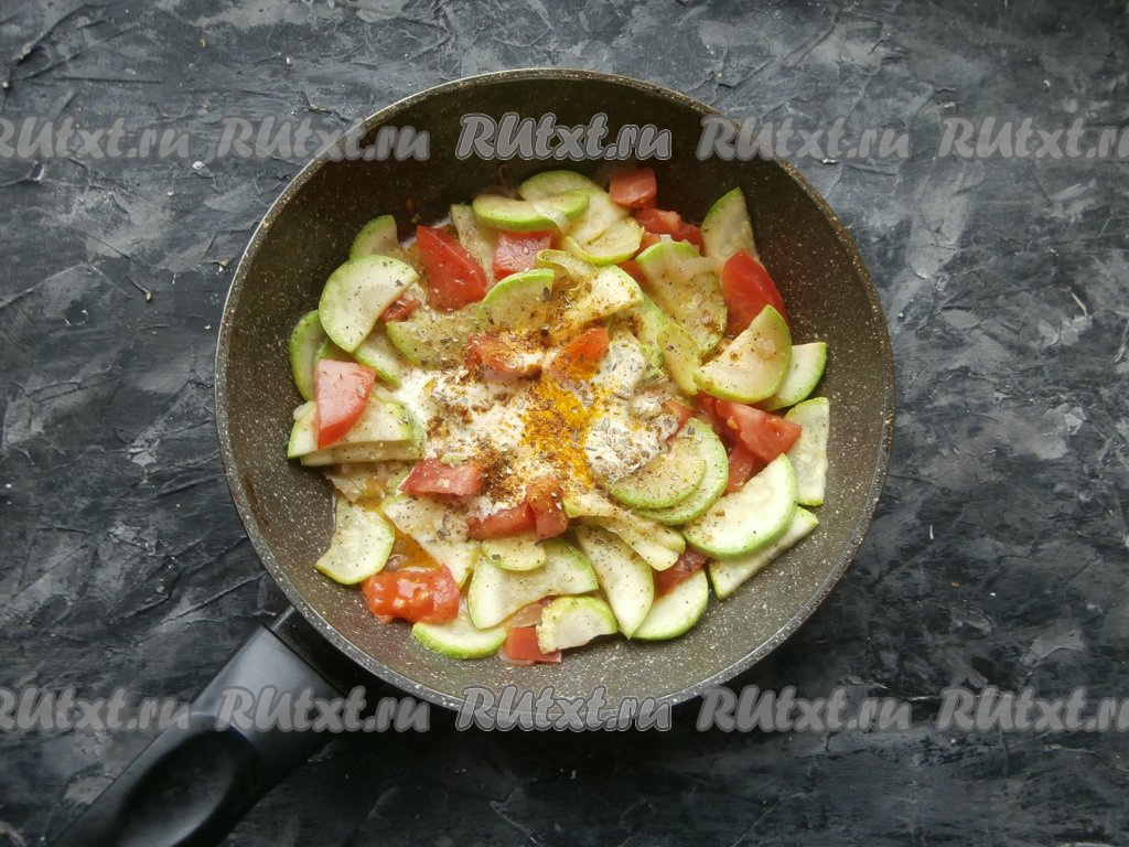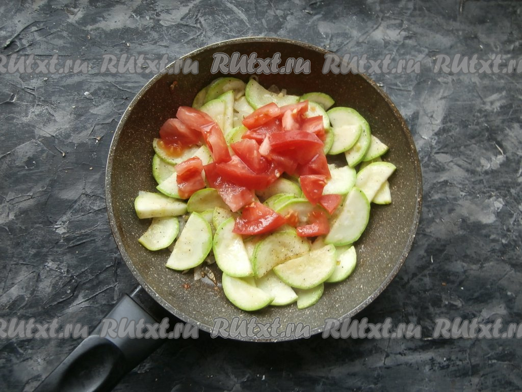 Обжарить кабачки, помешивая, на среднем огне в течение 2-3 минут, добавить свежие помидоры, нарезанные кубиками.