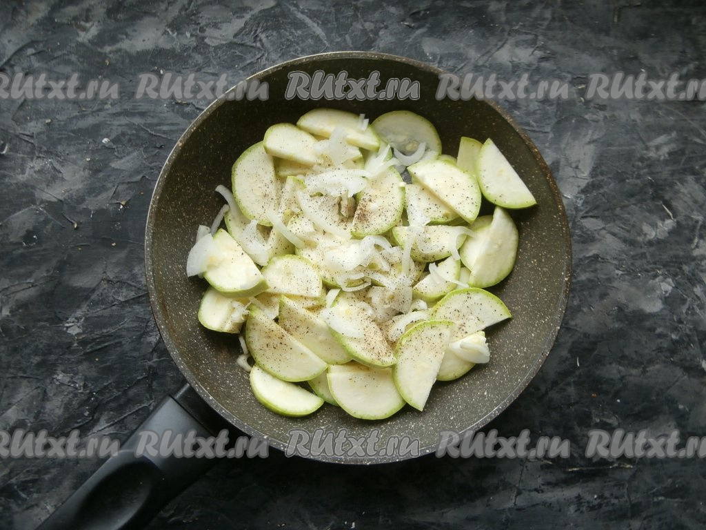 Выложить кабачки в разогретую с растительным маслом сковороду, добавить нарезанный тонкими полукольцами очищенный репчатый лук. Овощи посолить и поперчить.