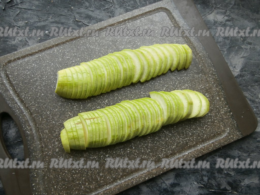 Кабачок нарезать достаточно тонкими полукружками (по 0,4-0,5 см толщиной). Если у кабачка тонкая кожица и мелкие семечки, можно готовить кабачки, не удаляя кожуру и семена.