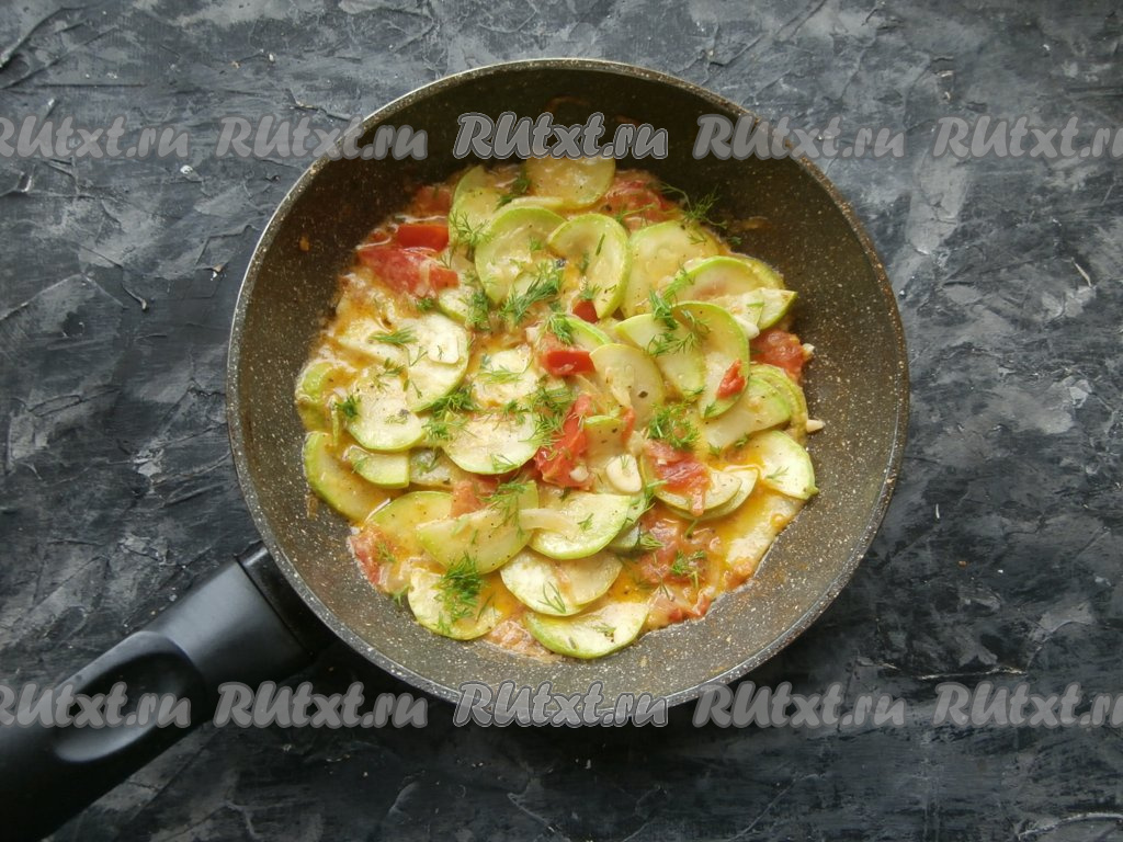 Тушить кабачки далее ещё около 4-5 минут, после этого посыпать измельчённым укропом, снять сковороду с огня.