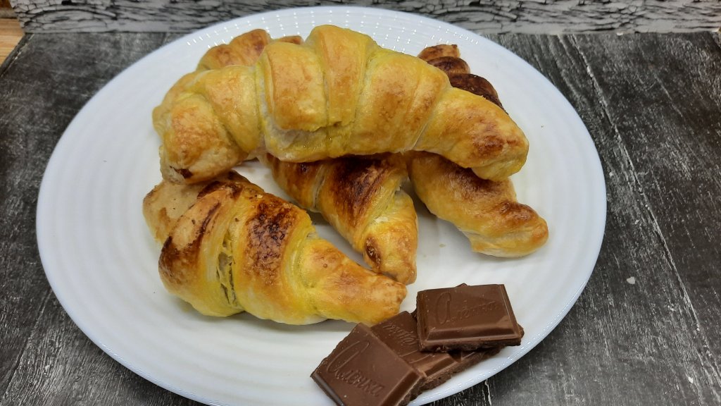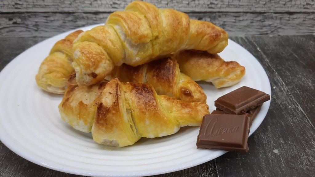 Через 5-7 минут достать выпечку из духовки. Ароматные круассаны с хрустящей, золотистой корочкой никого не оставят равнодушным и украсят чаепитие. Испеките в домашних условиях круассаны из слоёного бездрожжевого теста с начинкой из шоколада и эта простая, но необыкновенно вкусная выпечка станет для вас находкой!