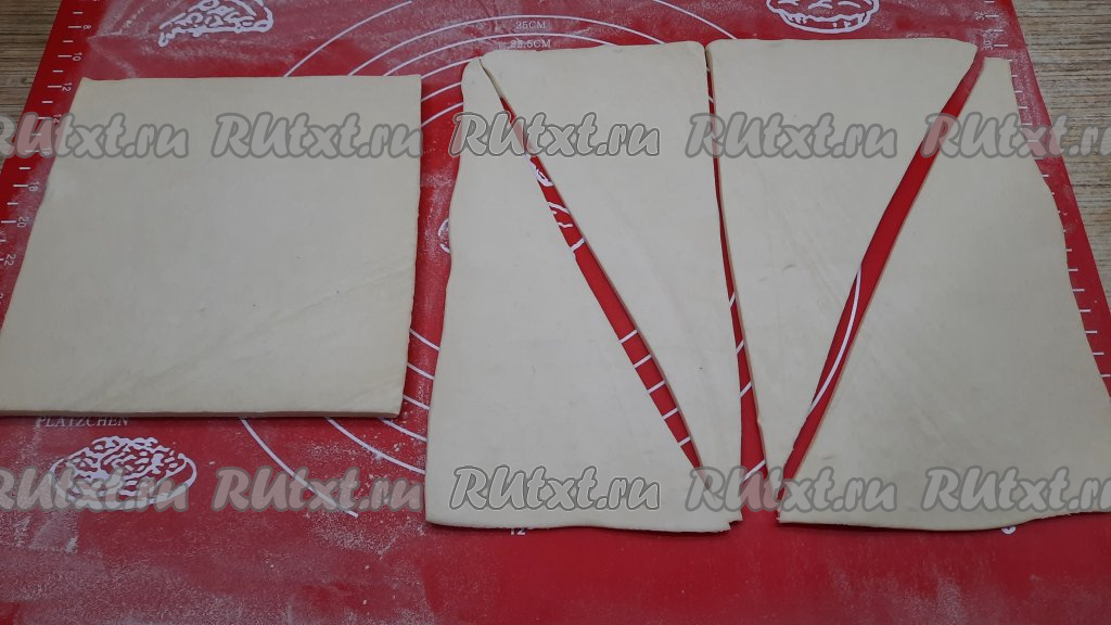 На поверхности, припылённой мукой, вначале один пласт размороженного теста раскатать с помощью скалки в одном направлении. Толщина раскатанного пласта должна быть, примерно, 3 мм. Раскатанный пласт разрезать на 2 прямоугольника. Затем каждый прямоугольник разрезать по диагонали на 2 треугольника. Из одного пласта получатся 4 треугольника (как на фото). Аналогично подготовить 4 треугольника из второго пласта теста.