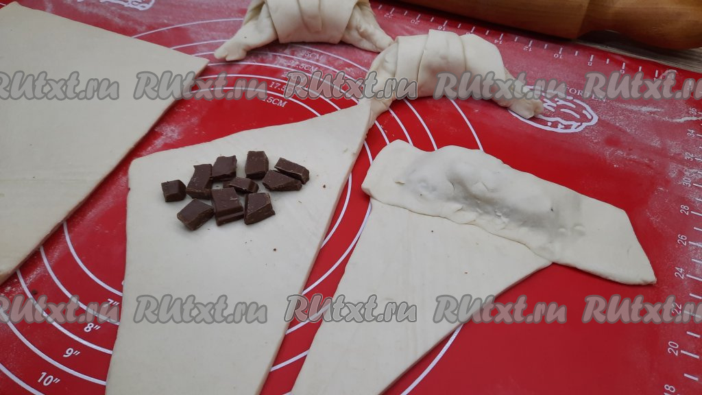 Всего у нас получатся 8 треугольников. На широкий край каждого треугольника, немного отступив от края, выложить кусочки шоколада. Накрыть шоколад широким свободным краем и хорошо придавить, чтобы шоколад в процессе выпекания не вытек. Свернуть каждый треугольник с тестом в рулетик, начиная от широкой стороны с начинкой. Придать каждому сформированному рулетику форму полумесяца.