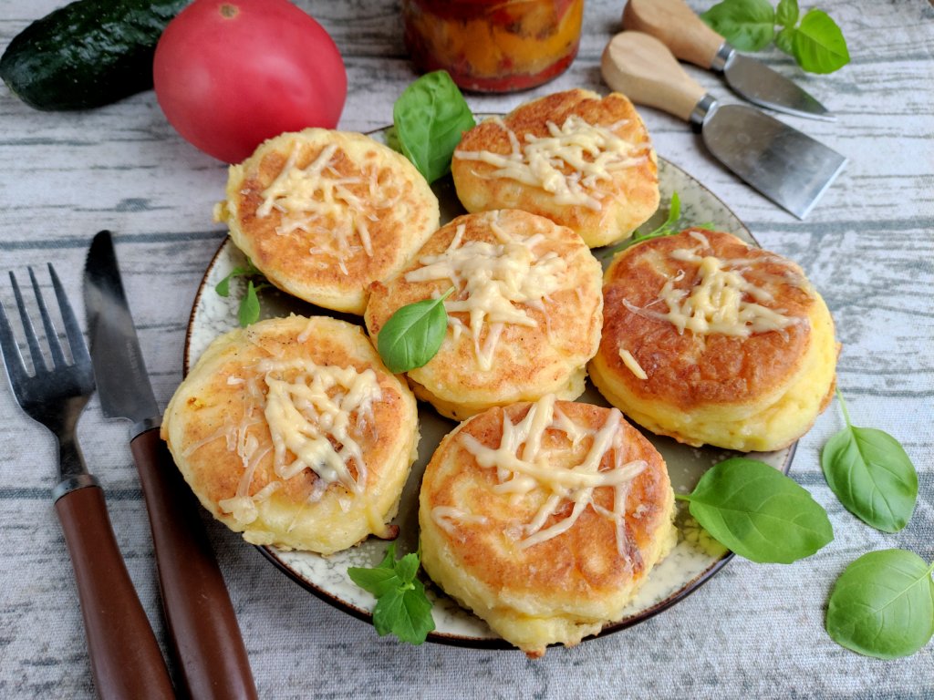 Соединить края лепёшки, сформировав шар с сырной начинкой внутри, приплюснуть, придавая форму сырника. Также сформировать остальные сырники. У меня получилось 6 штук. Часть натёртого сыра оставить для жарки сырников.
