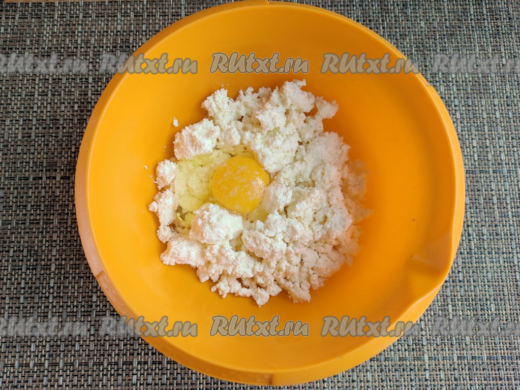 Творог, яйцо и соль выложить в объёмную миску.