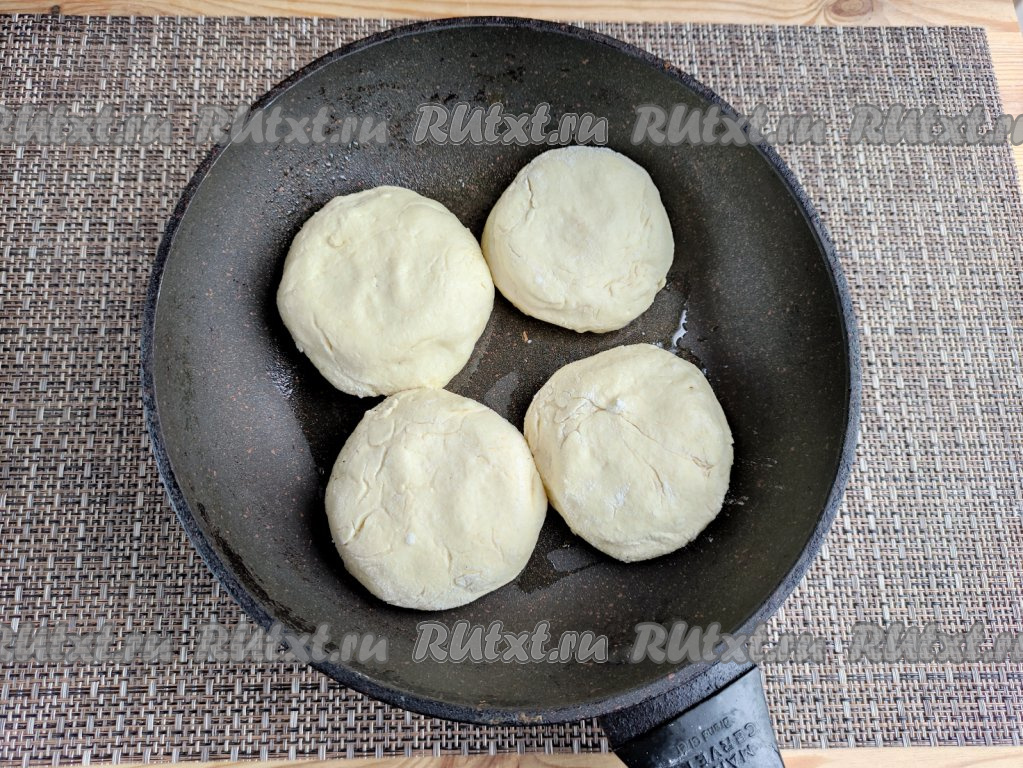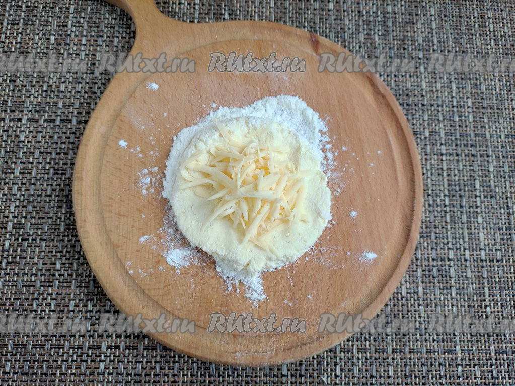 Скатать тесто на дощечке в шар, а затем сформировать лепёшку диаметром 3-4 см. По центру лепёшки выложить часть натёртого сыра.