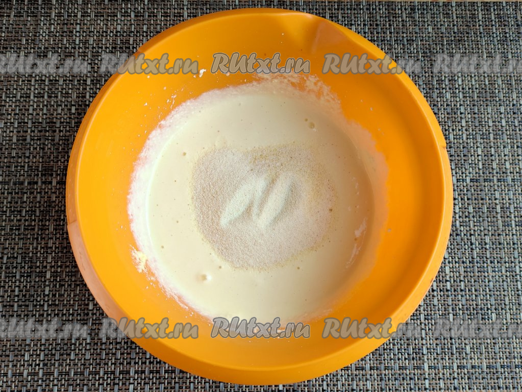 В получившуюся смесь всыпать манку, перемешать ложкой и оставить творожно-манное тесто минут на 20 при комнатной температуре (манка за это время набухнет).