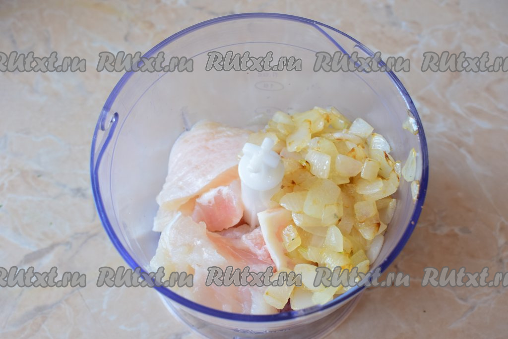 Измельчить кусочки рыбки и обжаренный лук в измельчителе (или пропустить через мясорубку). Должен получиться однородный рыбный фарш.