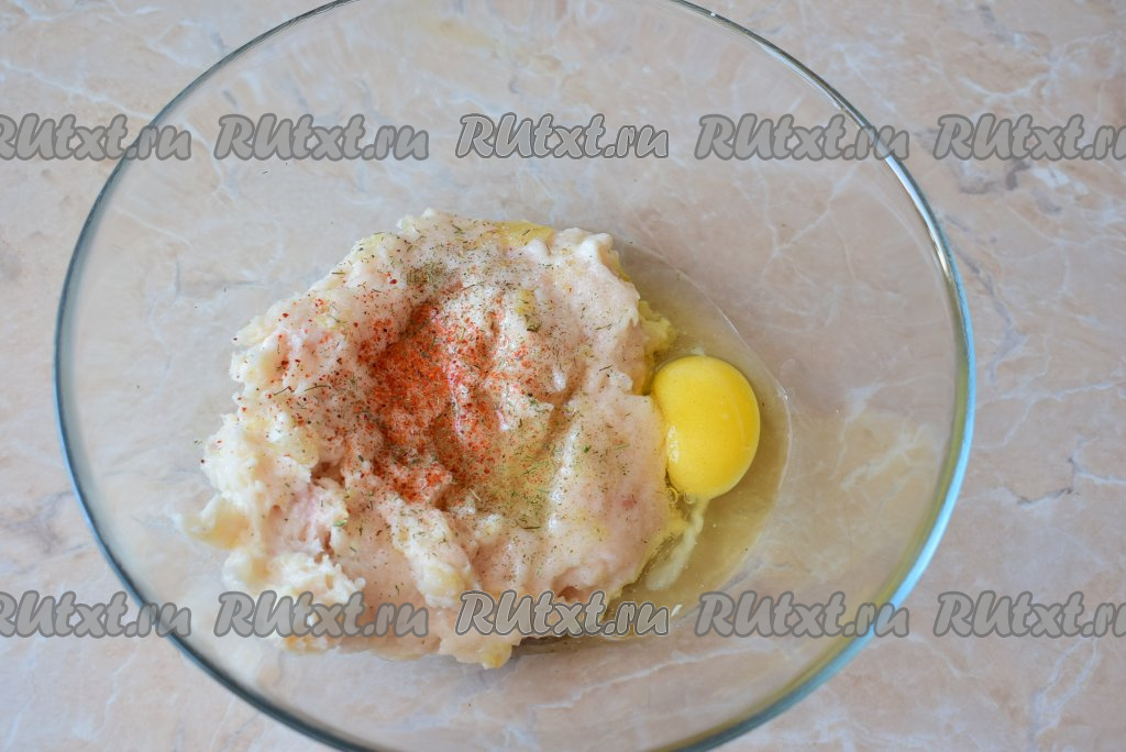 Затем переложить рыбный фарш в достаточно объёмную миску, добавить яйцо, специи и соль по вкусу.