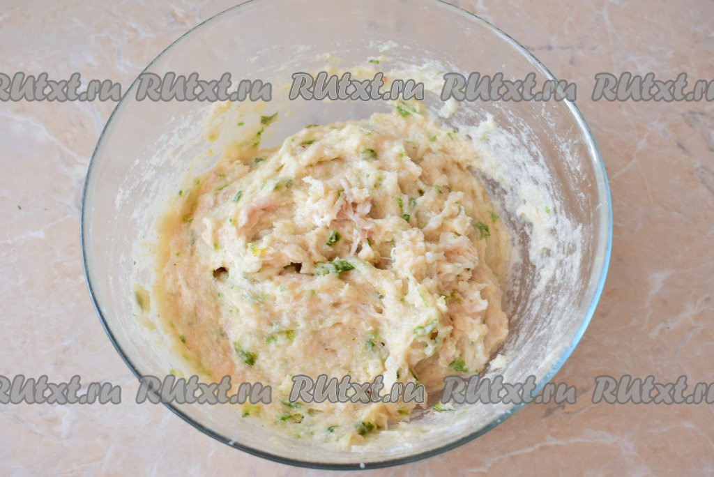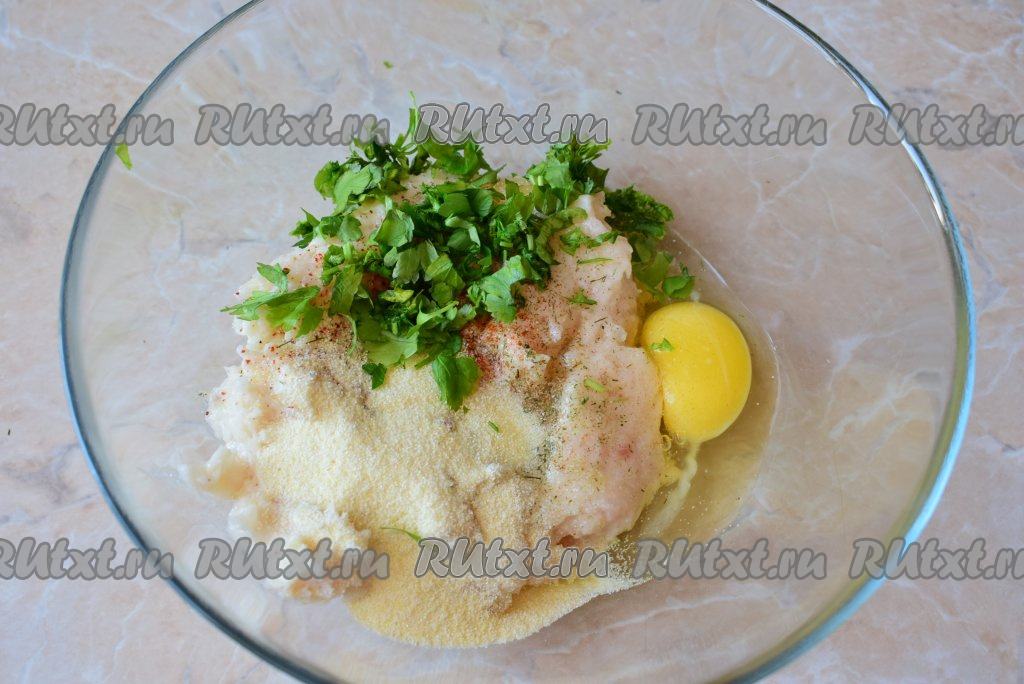 Сюда же всыпать 3 столовые ложки манной крупы, добавить немного мелко нарезанной зелени. Манка необходима для того, чтобы впитать в себя лишнюю влагу и сделать рыбный фарш более плотным. Тщательно фарш перемешать. Дать фаршу постоять, примерно, 10 минут (манка за это время набухнет и фарш станет более плотным). Если фарш по прошествии времени всё равно получился жидковатым, всыпьте ещё 0,5-1 столовую ложку манной крупы.