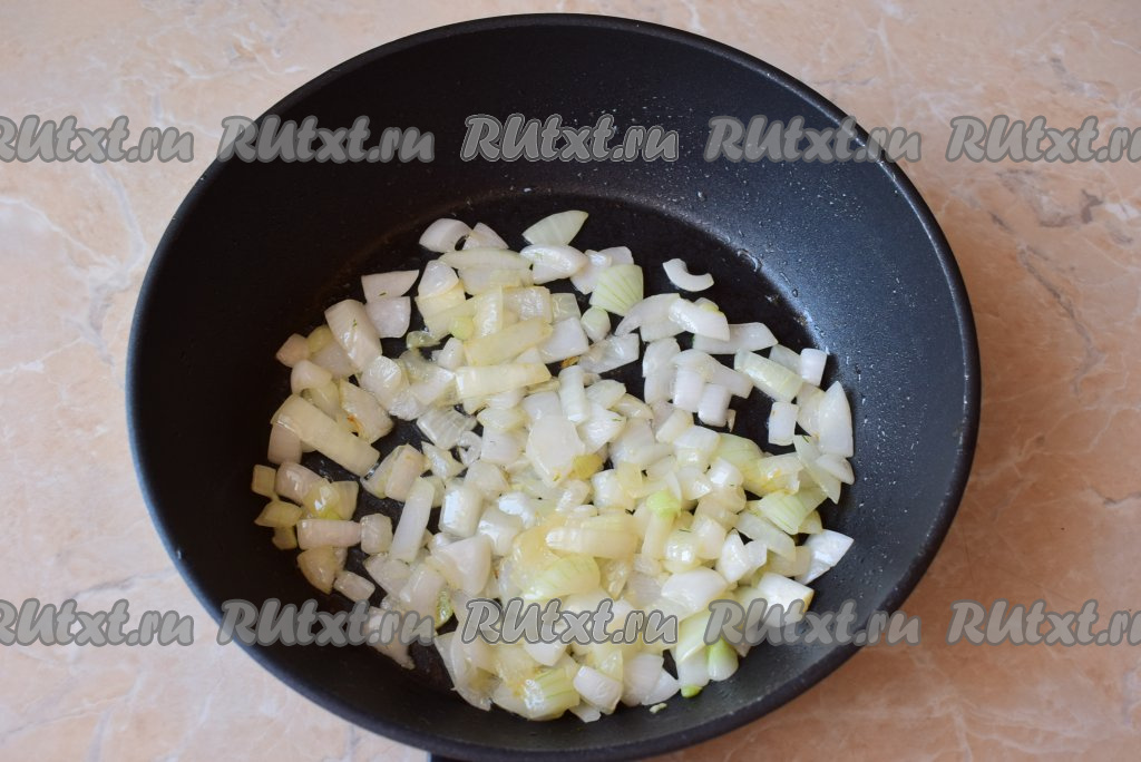 Разморозить филе пангасиуса при комнатной температуре. Очистить луковицу, мелко нарезать, выложить на сковороду, хорошо разогретую с небольшим количеством растительного масла, обжарить, помешивая, в течение 3-4 минут на среднем огне. Лук должен стать достаточно мягким. Обжаренному луку дать немного остыть.