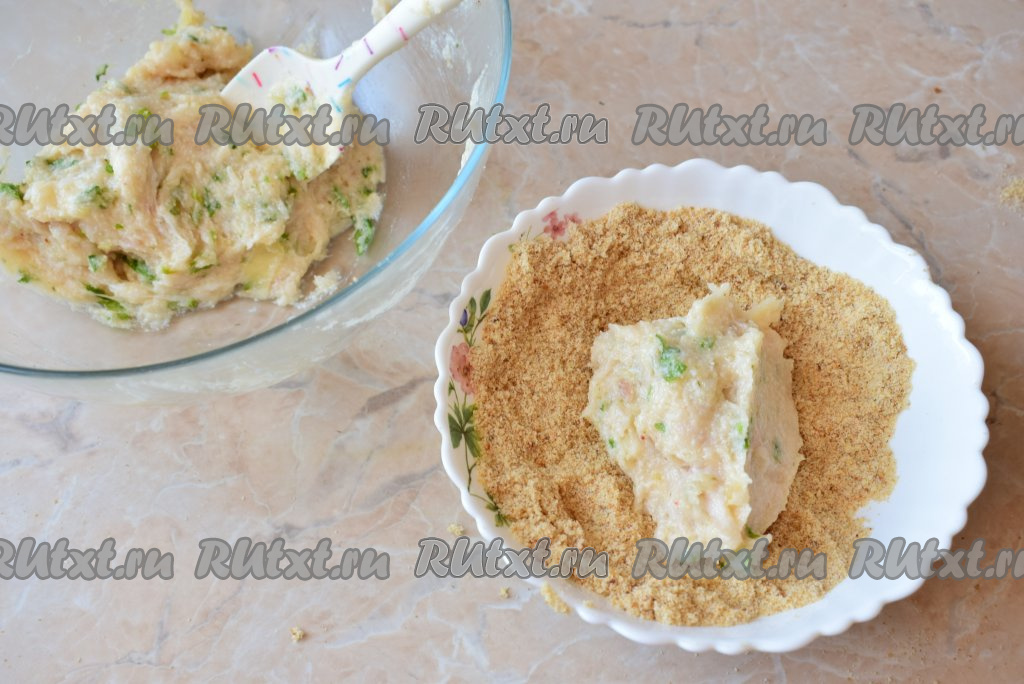 Насыпать в небольшую тарелку панировочные сухари. Брать часть рыбного фарша и выкладывать в панировочные сухари. Обваливая часть рыбного фарша в панировочных сухарях со всех сторон, сформировать котлету. Аналогично сформировать все рыбные котлетки.