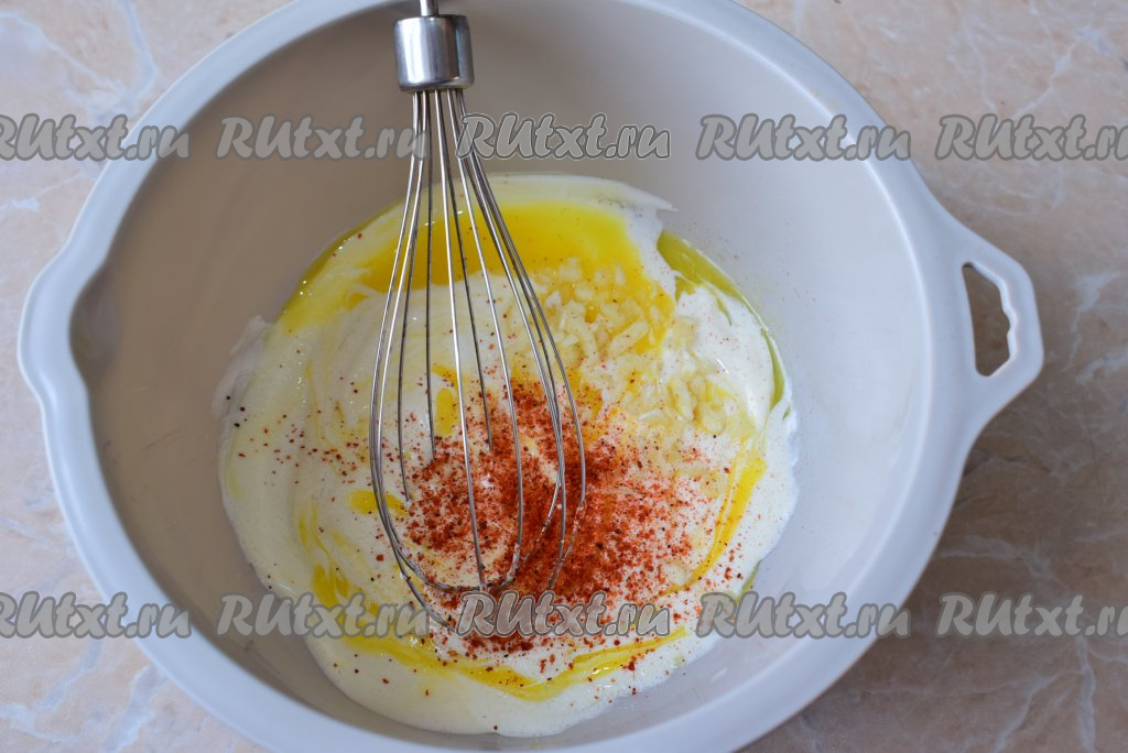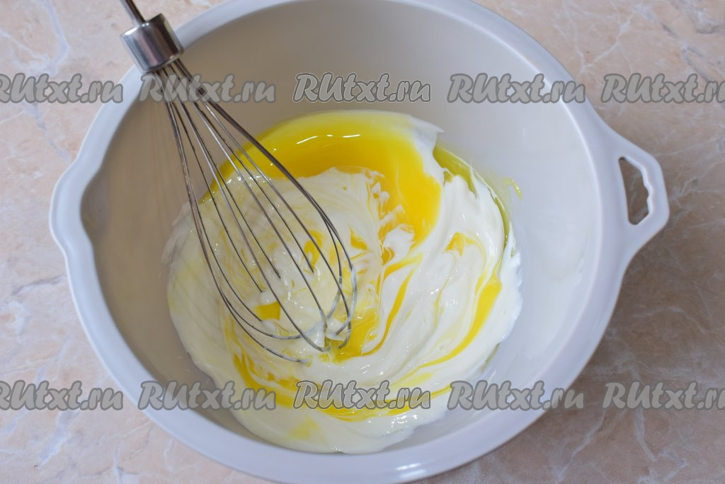 В отдельной чаше соедините майонез и сырое яйцо, перемешайте с помощью венчика.
