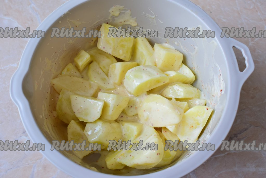 Нарезанный картофель выложите в смесь майонеза, яйца и чеснока, хорошо перемешайте, чтобы чесночно-майонезный соус полностью покрыл кусочки картошки со всех сторон.