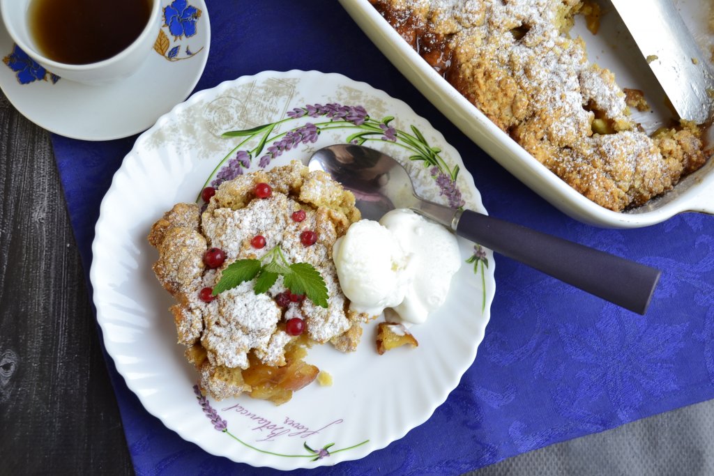 Теперь ароматный и очень вкусный яблочный крамбл можно украсить ягодками, листиками мяты, нарезать на части и подать к столу с мороженым.