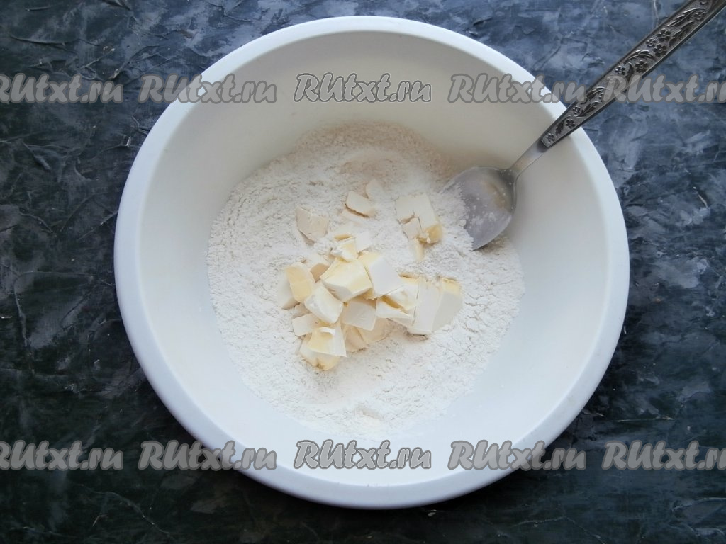 В мучную смесь выложить кусочки размягчённого сливочного масла (для того чтобы масло размягчилось, его нужно заранее достать из холодильника, чтобы оно согрелось и стало мягким при комнатной температуре).