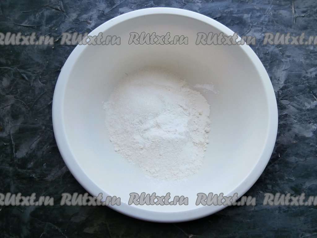 Вначале приготовим тесто-крошку, для этого в достаточно объёмной миске нужно соединить муку, ванильный сахар, соль, разрыхлитель и сахар, тщательно перемешать получившуюся мучную смесь.