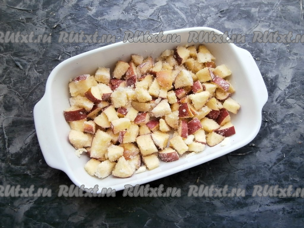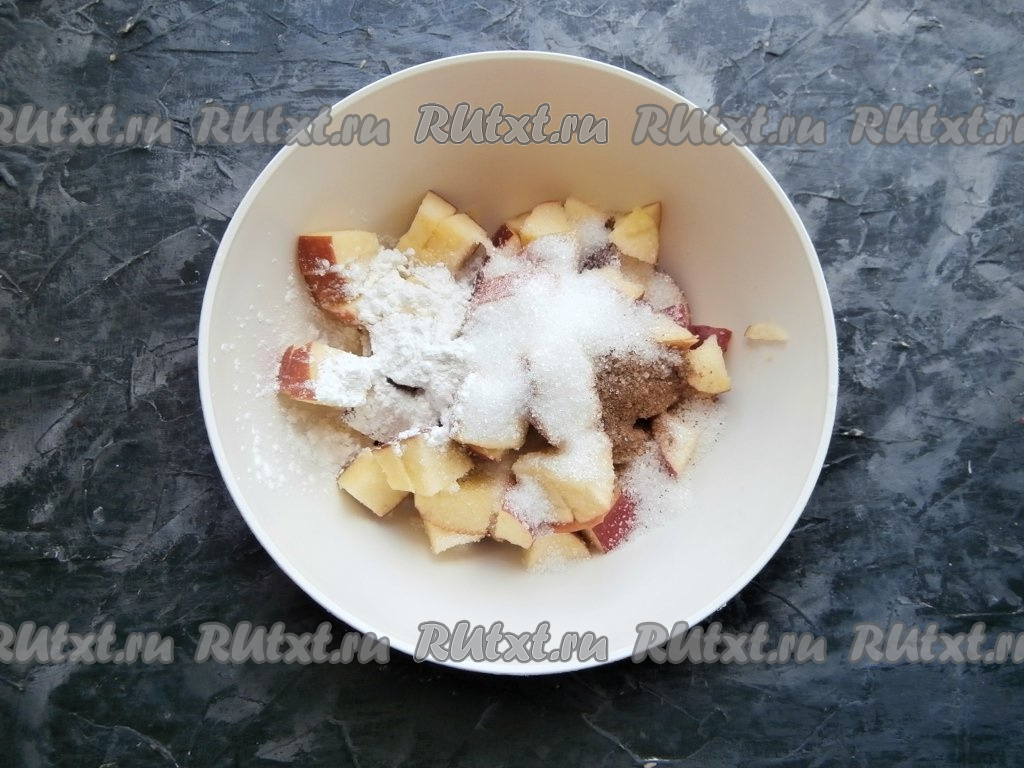 Теперь приготовим начинку крамбла, для этого яблоки, предварительно удалив из них сердцевины, нужно нарезать средними кубиками, затем всыпать к ним сахар, корицу и крахмал, перемешать.