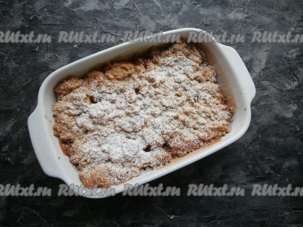 Дать крамблу остыть в форме до тёплого состояния, посыпать сахарной пудрой.