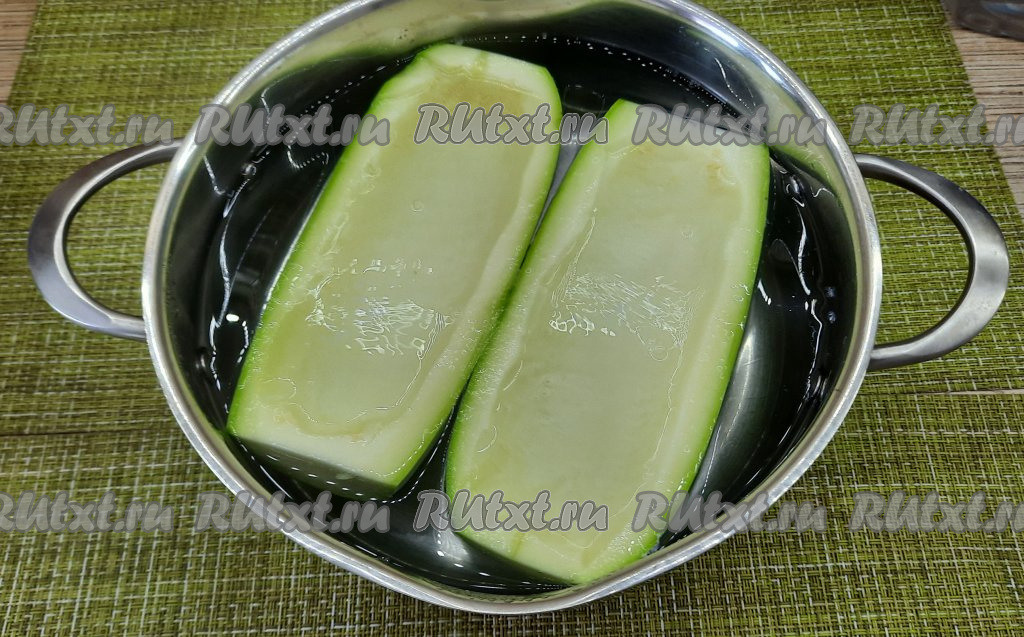 Взять достаточно объёмную кастрюлю, в неё должны полностью помещаться лодочки (как на фото). В кастрюле вскипятить воду, добавив в неё 1/2 чайной ложки соли. В кипящую воду опустить кабачковые лодочки на 2 минуты, затем сразу вынуть кабачки из кипятка и дать полностью остыть.