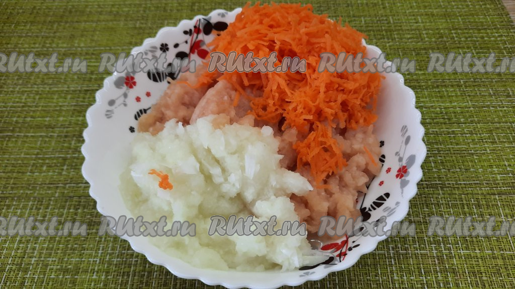 Куриный фарш для этого блюда можно взять покупной, а можно получить его, пропустив кусочки куриного мяса через мясорубку. В глубокой тарелке смешать куриный фарш, измельчённый лук и натёртую морковь, добавить 1/2 чайной ложки (или по вкусу) соли и хорошо перемешать.