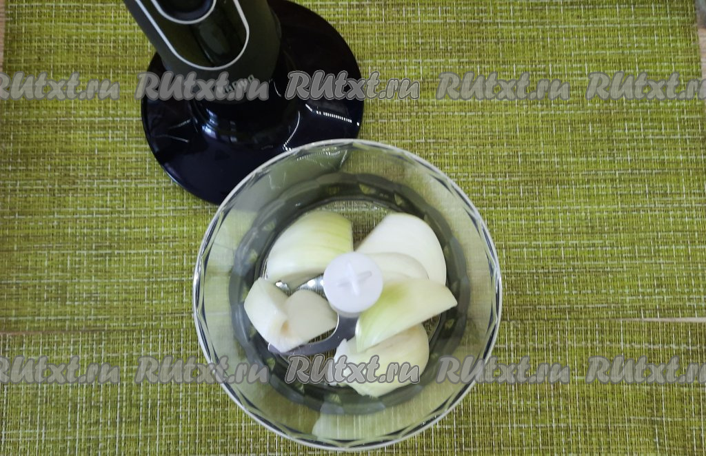 Лук очистить, измельчить с помощью блендера (или просто мелко нарезать ножом).