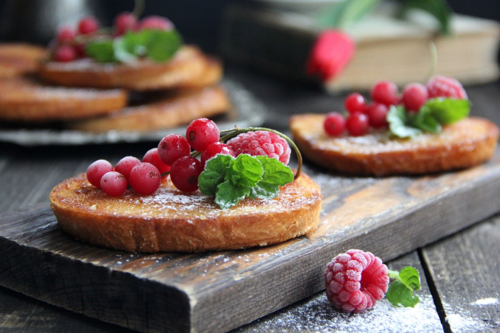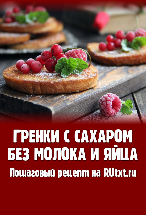 Вкусные, аппетитные, приятно похрустывающие гренки, приготовленные с сахаром без добавления молока и яиц, сразу подать к чаю, украсив, по желанию, свежими ягодами.