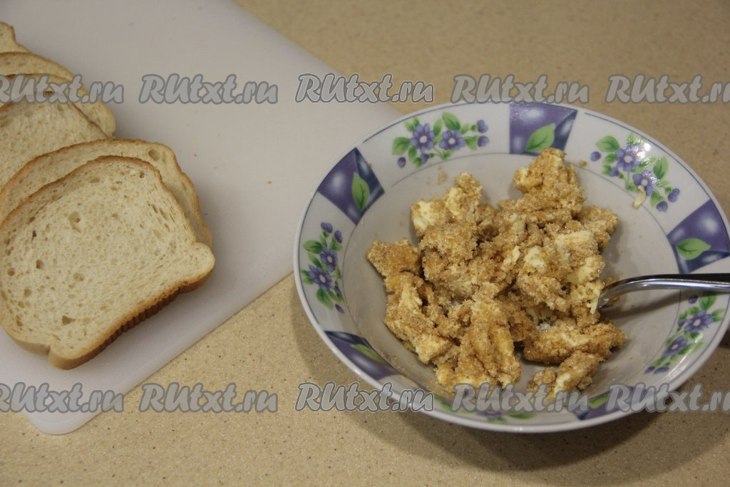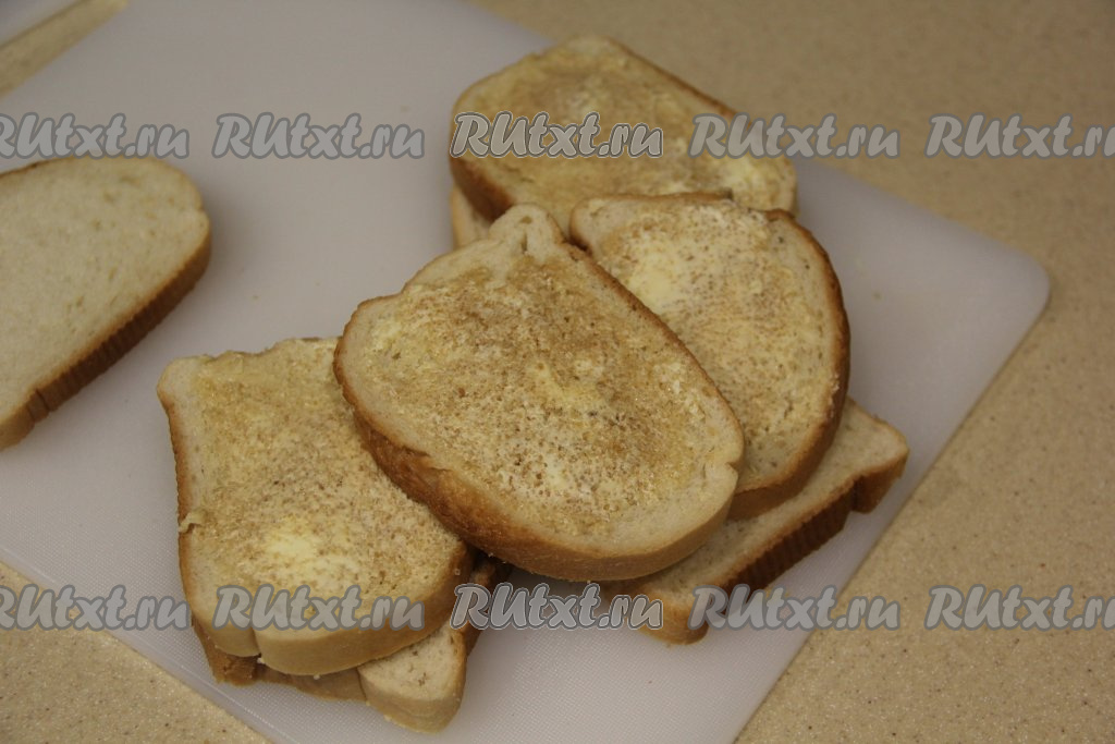 Намазать кусочки батона с двух сторон получившейся смесью масла и сахара.