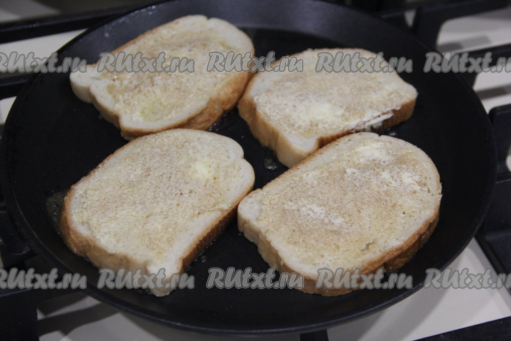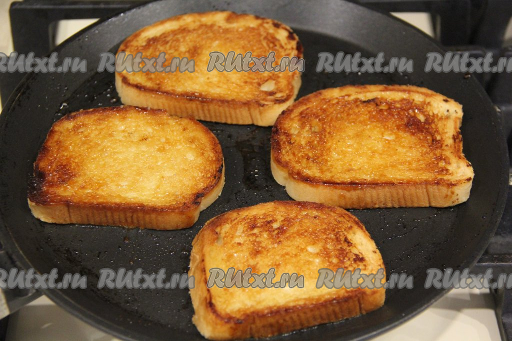 Жарить гренки на среднем огне, примерно, по 2 минуты с каждой стороны (до золотистого цвета).