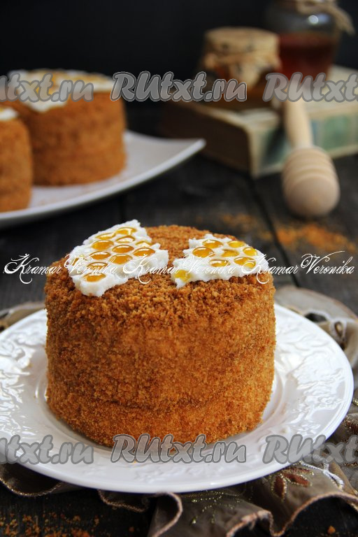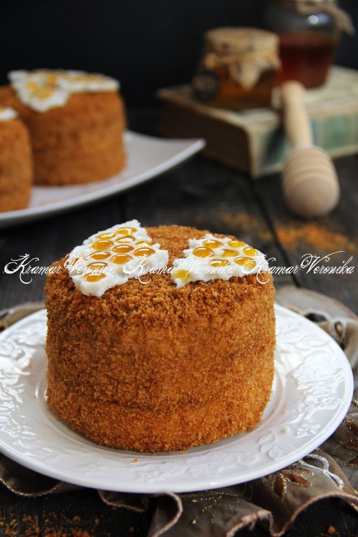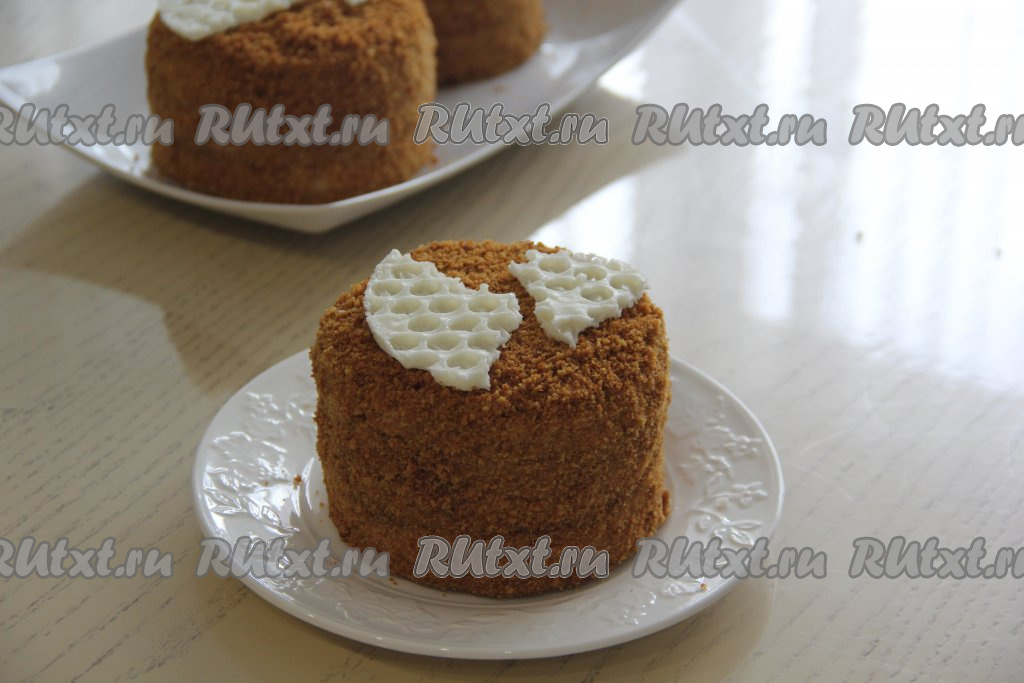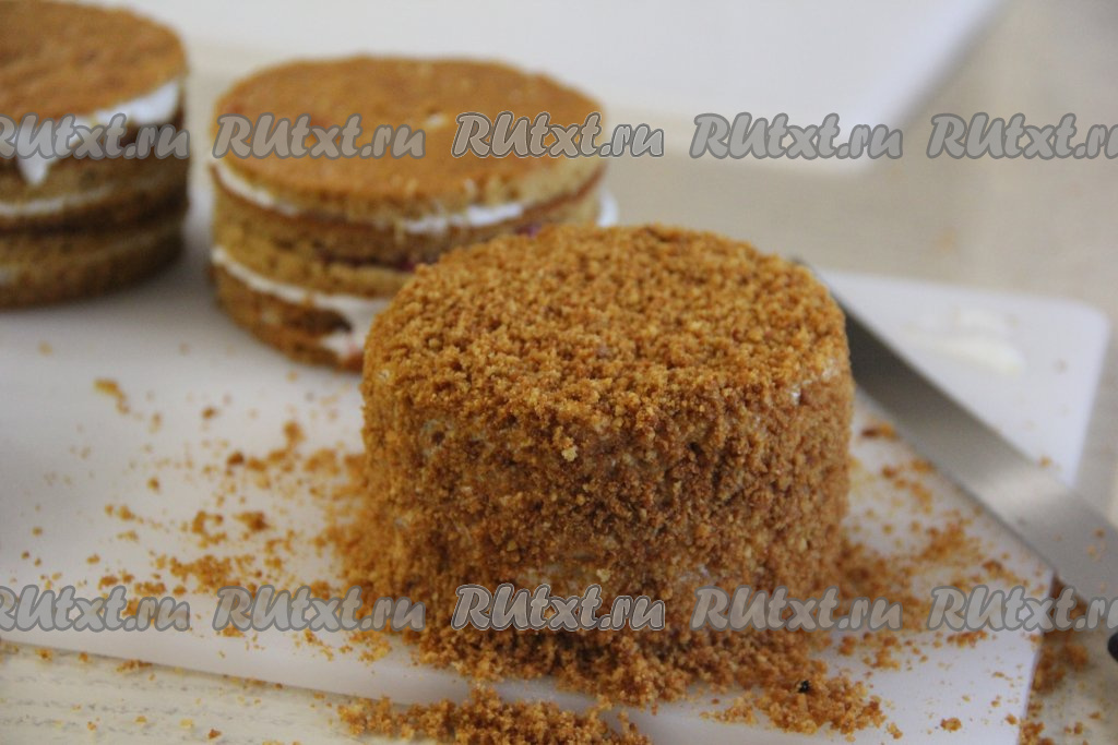 Затем обмазать медовые пирожные сметанным кремом со всех сторон. Остатки бисквитных коржей немного подсушить в духовке и измельчить в крошку. Обсыпать полученной крошкой пирожные со всех сторон и убрать для пропитки в холодильник на ночь. У меня получилось 5 пирожных диаметром 14 см, если делать пирожные диаметром 10 см, тогда получится 7 штук.