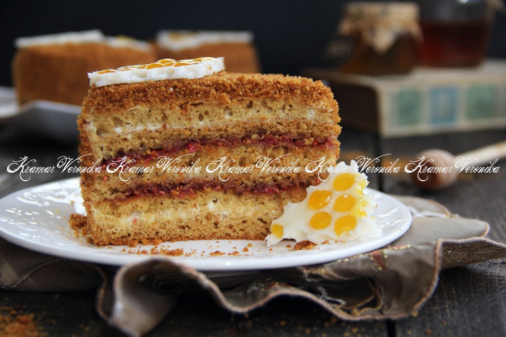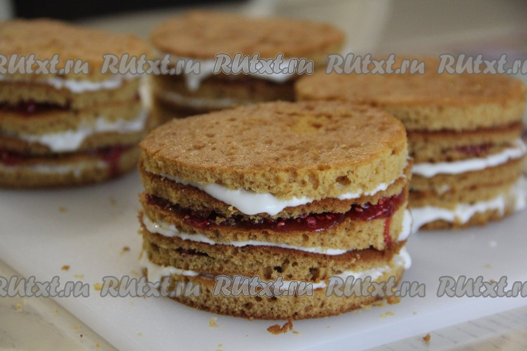 Сформировать медовые пирожные, выкладывая друг на друга 5 коржей, промазывая каждый корж сметанным кремом или ягодной начинкой. Я чередовала коржи: корж, промазанный сметанным кремом, чередовался с коржом, промазанным малиной с сахаром.