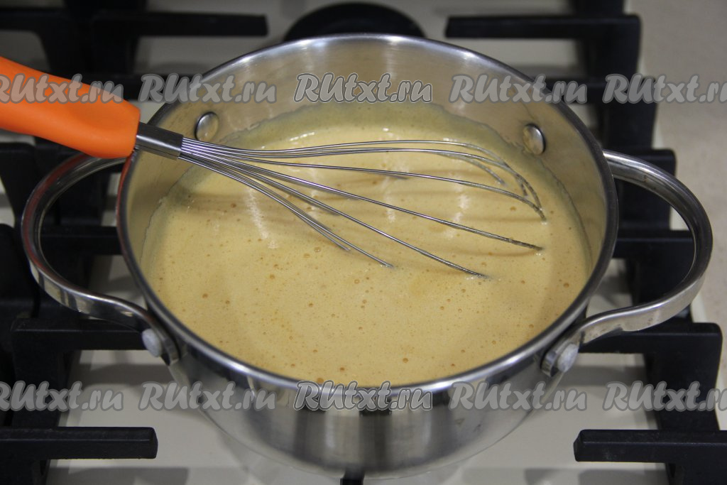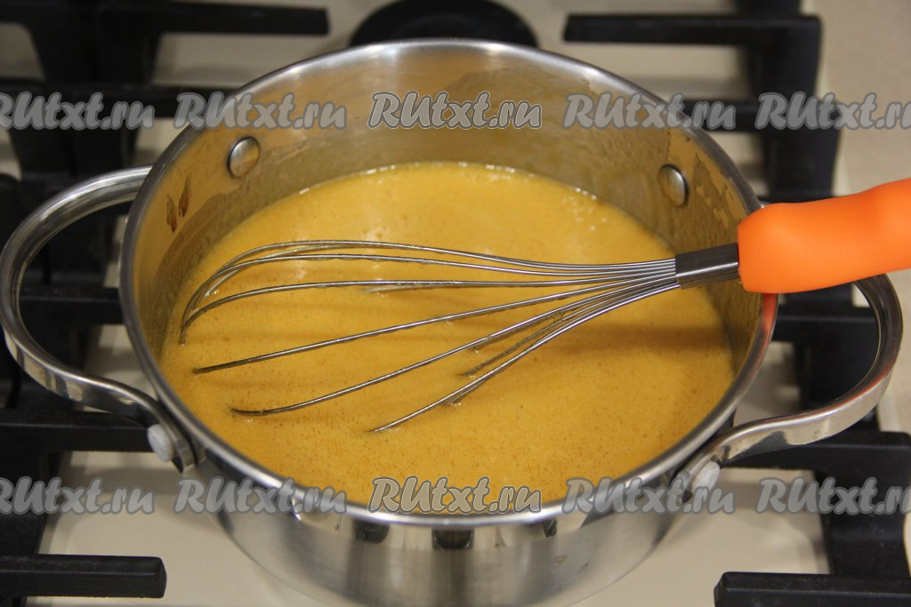 Помешивая венчиком, томить массу на медленном огне. Она станет светлеть и увеличится в объёме (как на фото).