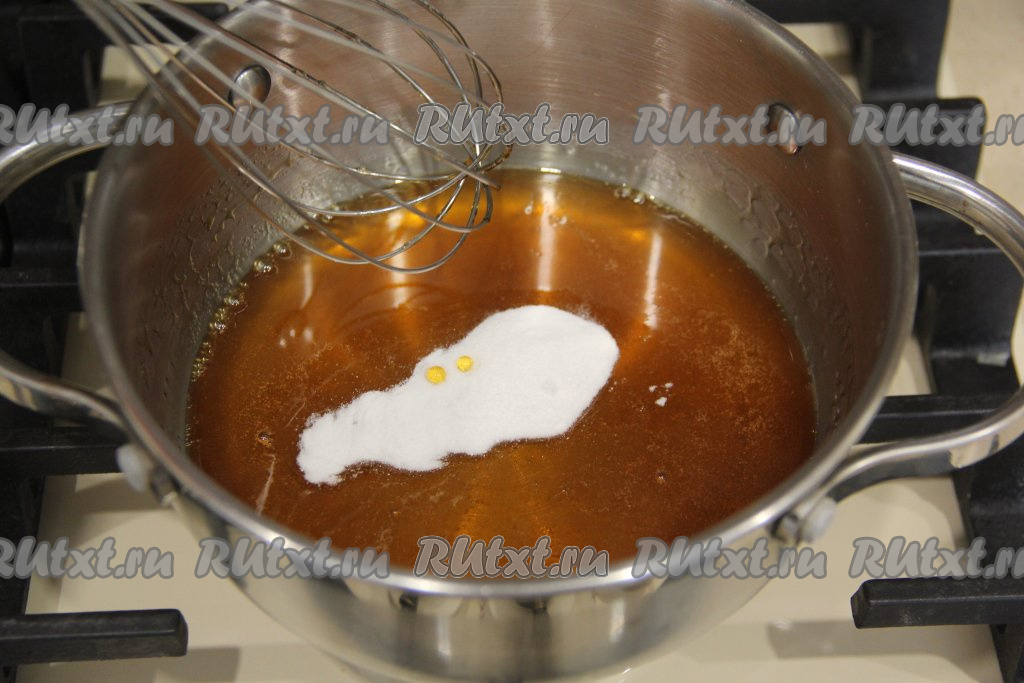 Мёд выложить в сотейник, поставить на небольшой огонь и прогреть, помешивая, до растапливания мёда (мёд должен стать достаточно жидким), затем всыпать соду.