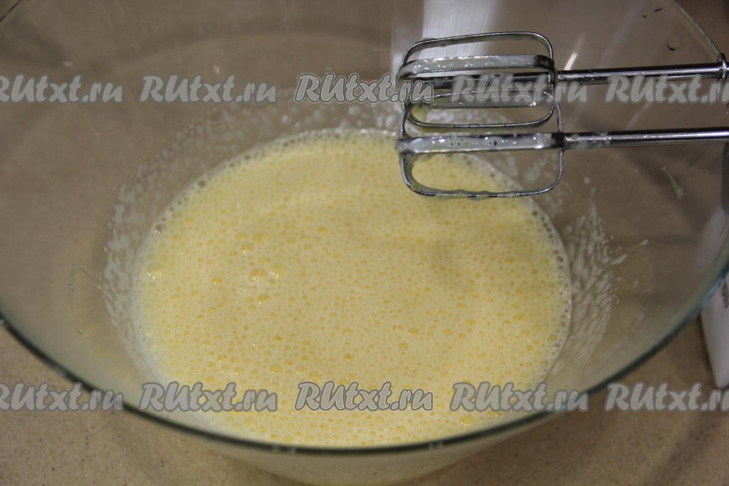Взбивать яйца с сахаром в течение 7 минут с помощью миксера. Масса станет светлой и пышной, а сахар полностью растворится.