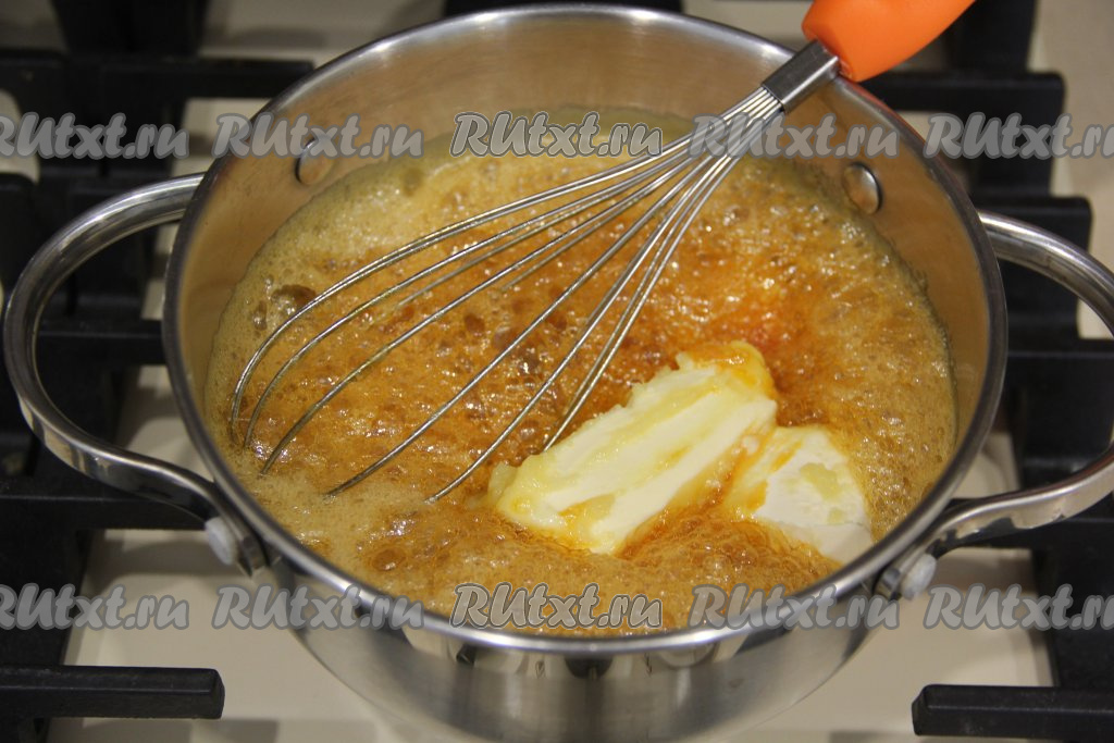 Масло постепенно полностью растопится и масса снова увеличится в объёме. Убрать сотейник с огня и дать медовой смеси немного остыть.