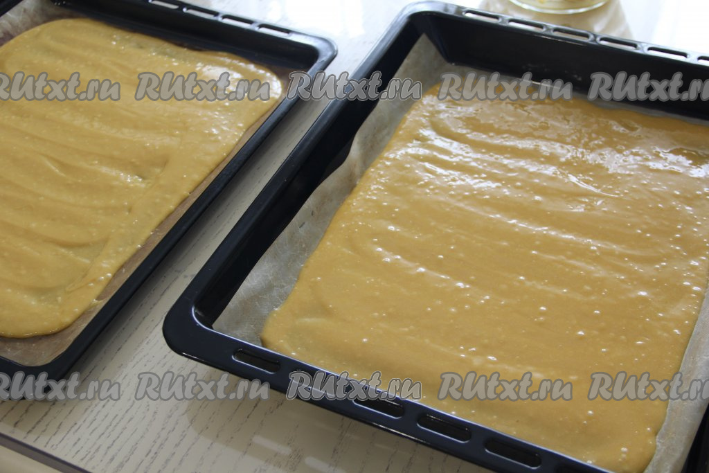 Застелить 2 противня (у меня размер противней 40 см х 50 см) пергаментом, затем выложить тесто на противни, распределяя его равномерно.